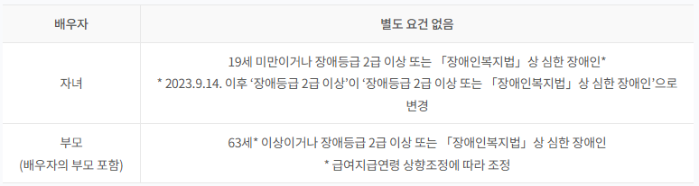 - 부모: 만 60세 이상이거나 장애등급 2급 이상인 부모