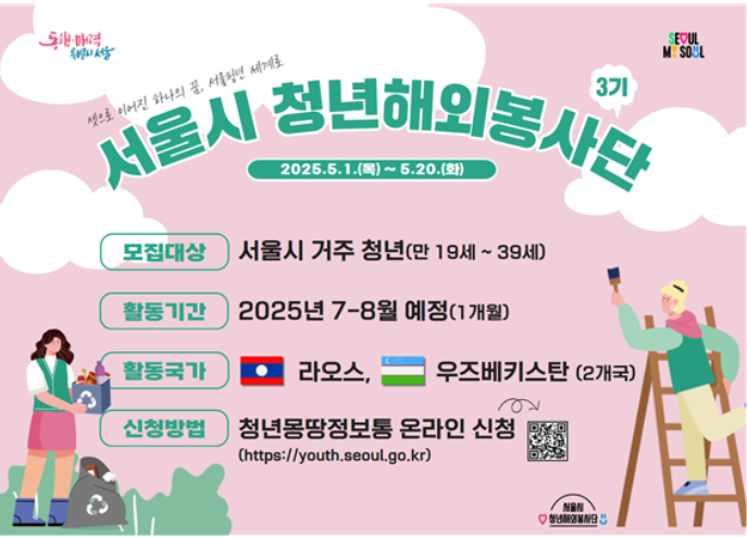 서울시에 거주하는 청년이라면 누구나 도전할 수 있는 이번 봉사단 활동은 다양한 국가에서의 현장 경험과 함께, 글로벌 시민으로서의 자질을 키우는 데 큰 도움이 됩니다. 신청 마은 2025년 5월 20일(화)까지 신청 접수 가능합니다. 기간이 얼마 남지 않았으니 아래 링크를 통해 서둘러 신청하세요.