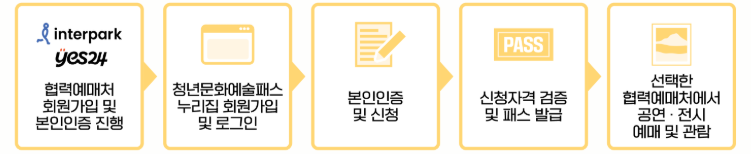 ※ 신청 전 청년문화예술패스를 사용할 협력예매처[2곳 중 선택1] 회원가입 및 본인인증이 완료되어야 정상 발급 가능